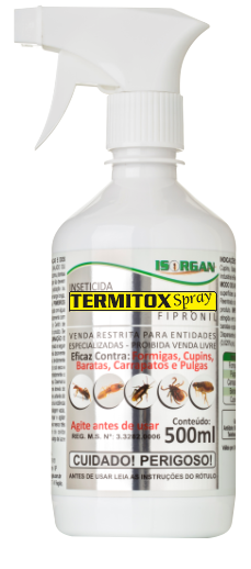 TERMITOX Spray é formulado com ingredientes ativos usados com grande segurança em vários agroecossistemas no controle de diferentes insetos praga, e reconhecido através de testes toxicológicos por não ser agressivo a animais de sangue quente (vertebrados), sendo portanto nocivo somente a animais de sangue frio (invertebrados: cupins, formigas, baratas, etc).